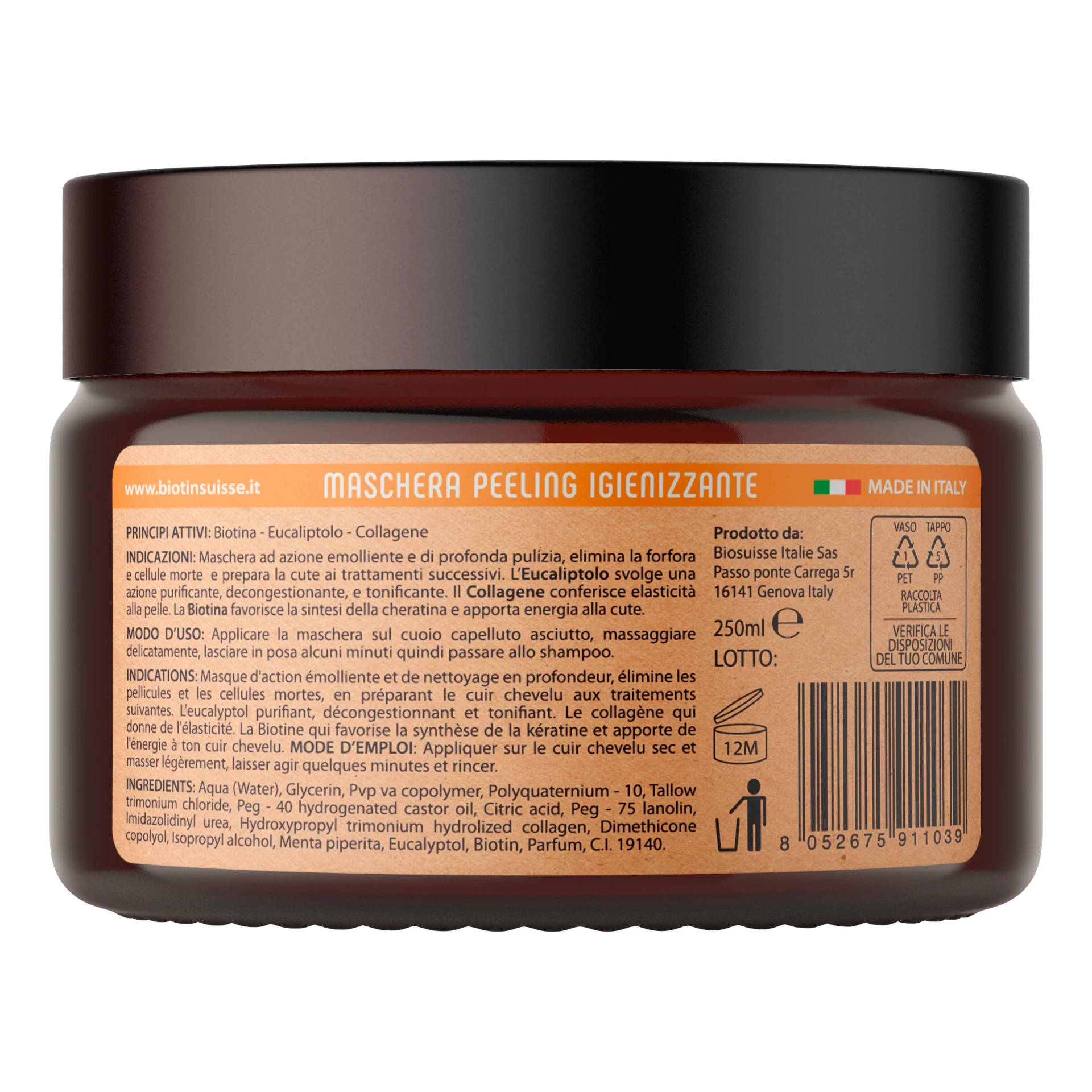 • Maschera ad azione emolliente e di profonda pulizia, elimina la forfora e cellule morte e prepara la cute ai trattamenti successivi.